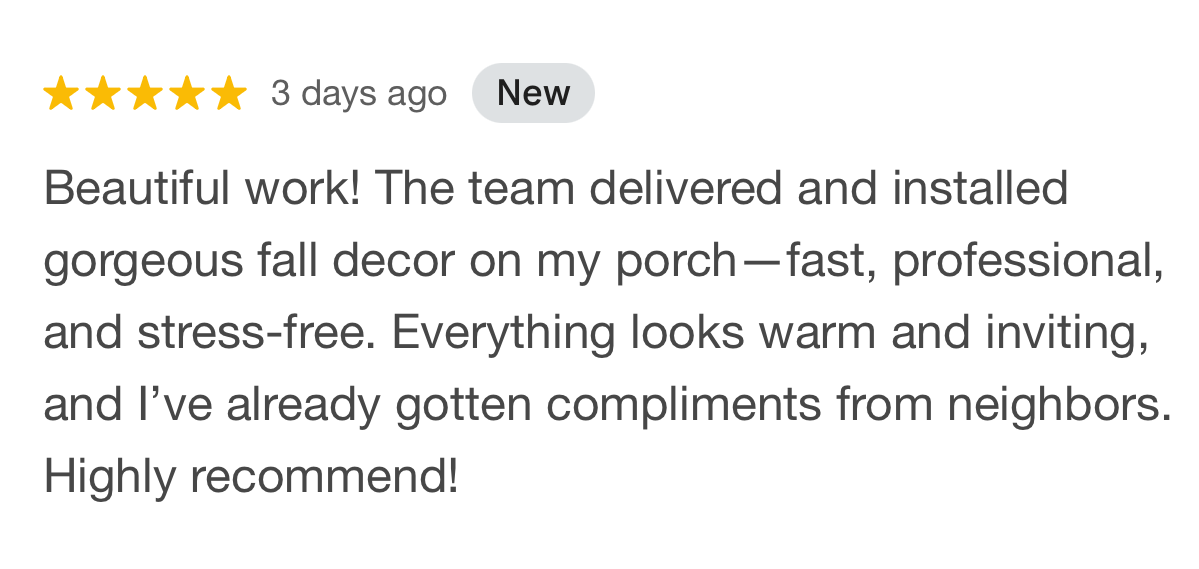 Customer review with a 5-star rating and a 'New' label, praising the professional installation of fall decor on a porch.