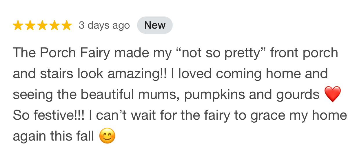 We started The Porch Fairy in 2024 to offer seasonal porch decorating services to Chapel Hill, Durham, Cary, Apex, Raleigh, Hillsborough and Pittsboro.